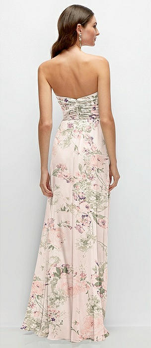 Strapless Pleated Surplice Chiffon Maxi Dress with A-Line Skirt in coquette floral print