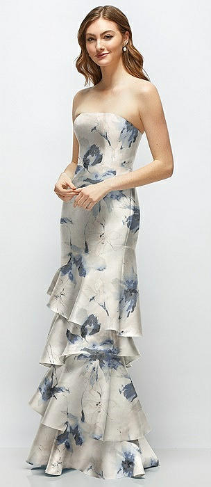 Floral Strapless Bodycon Maxi Dress with Tiered Ruffle Skirt in inkwash blue floral