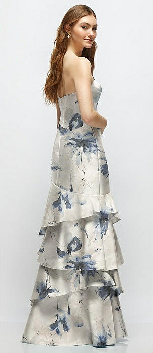 Strapless Floral Satin Gown with Full Skirt and Covered Buttons at Back in porcelain blue seraphina floral