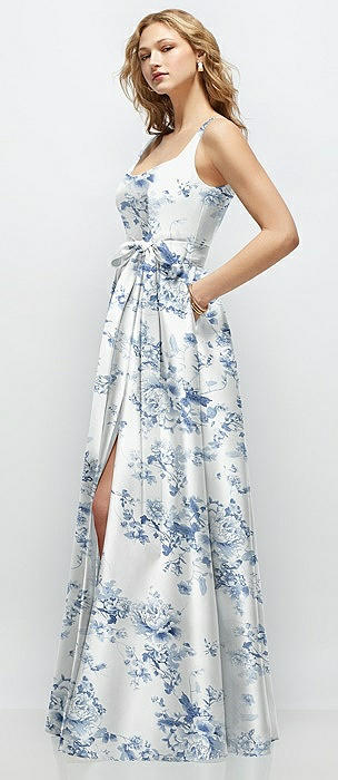 Floral Bateau Neck Satin Column Dress with Bow-Trimmed Skinny Belt in porcelain blue seraphina floral