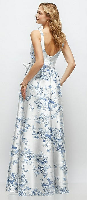 Bow One-Shoulder Satin Floral Maxi Dress with Trumpet Skirt in cottage rose larkspur