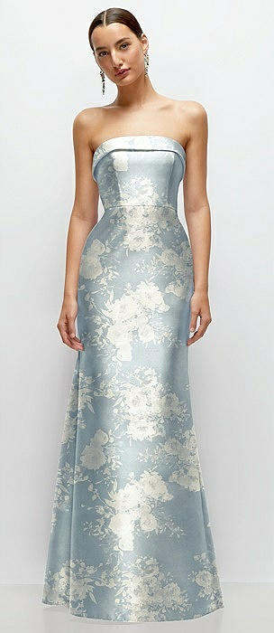 Strapless Cuff Neckline Floral Satin Trumpet Gown in porcelain blue seraphina floral
