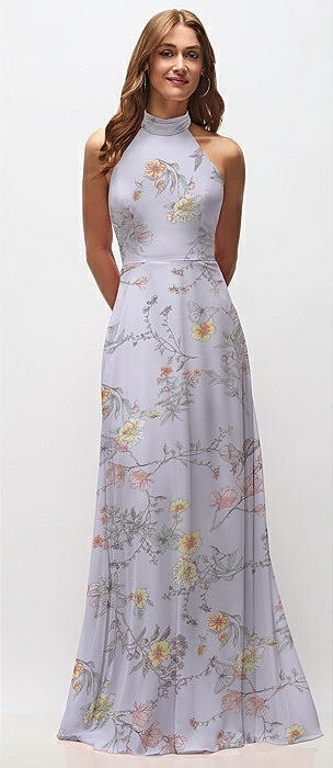 High Neck Halter Backless Maxi Dress in butterfly botanica silver dove