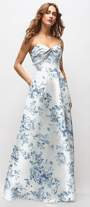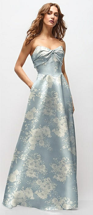 Strapless Bias Cuff Bodice Floral Satin Gown with Pockets in bow and blossom print