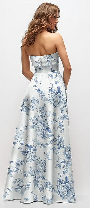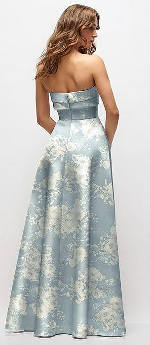 Strapless Bias Cuff Bodice Floral Satin Gown with Pockets in porcelain blue seraphina floral