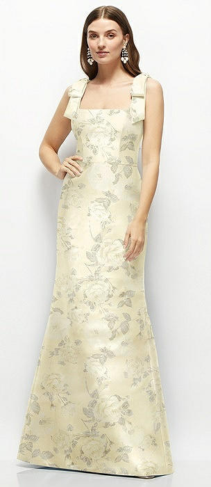 Floral Satin Fit and Flare Maxi Dress with Shoulder Bows in butter yellow floral