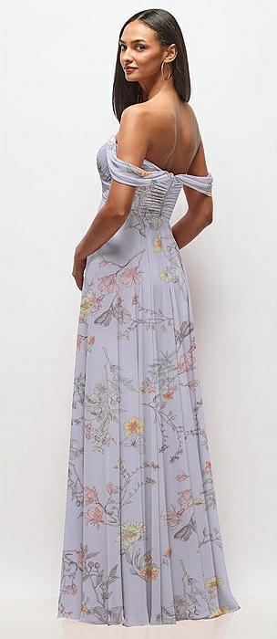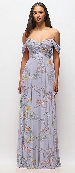 Off-the-Shoulder Draped Chiffon Maxi Dress in butterfly botanica silver dove