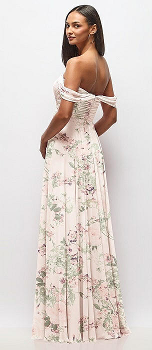 Off-the-Shoulder Draped Chiffon Maxi Dress in coquette floral print