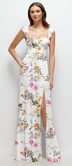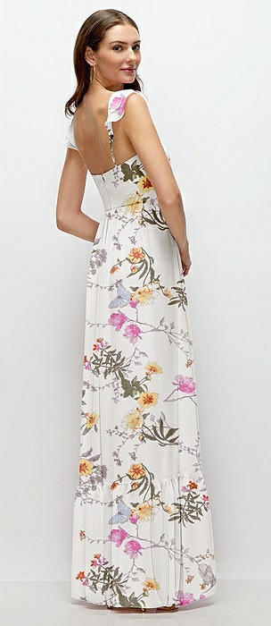 Ruffle Strap Chiffon Bustier Maxi Dress with Ruffle Hem A-Line Skirt in butterfly botanica ivory