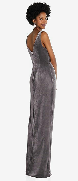 High-Neck Cap Shoulder Pleated Bodice Velvet Column Maxi Dress in caviar gray