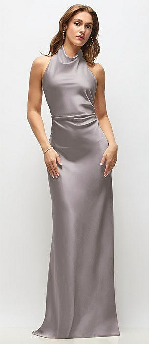 High Cowl Neck Open-Back Stretch Satin Bias Maxi Dress in cashmere gray