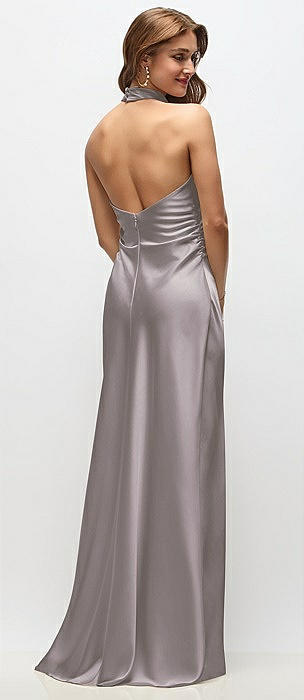 Draped Scarf Halter Open-Back Stretch Satin Bias Maxi Dress with Adjustable Straps in cashmere gray
