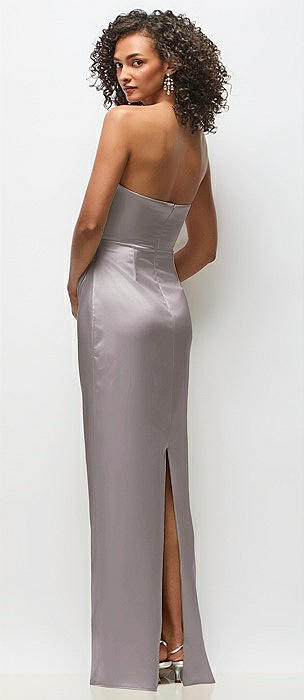 Strapless Draped Bodice Stretch Satin Column Maxi Dress in cashmere gray