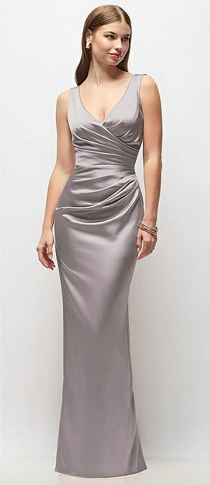 Sleeveless Draped Wrap Bodice Stretch Satin Column Maxi Dress in cashmere gray