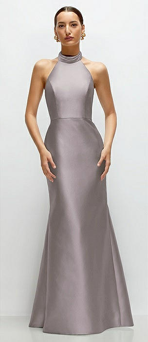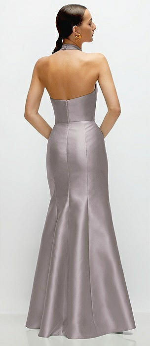 High-Neck Halter Open-Back Satin Trumpet Dress in cashmere gray