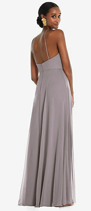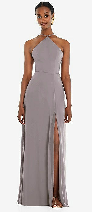 High Halter Tie-Strap Open-Back Satin Maxi Dress in cashmere gray
