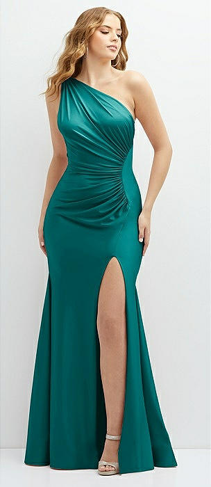 Asymmetrical Open-Back One-Shoulder Stretch Satin Mermaid Dress in peacock teal