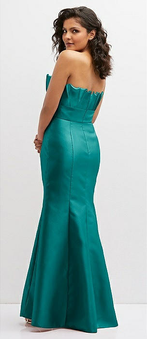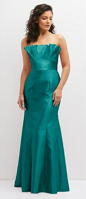 Strapless Basque-Neck Draped Stretch Satin Mermaid Dress with Horsehair Hem in peacock teal
