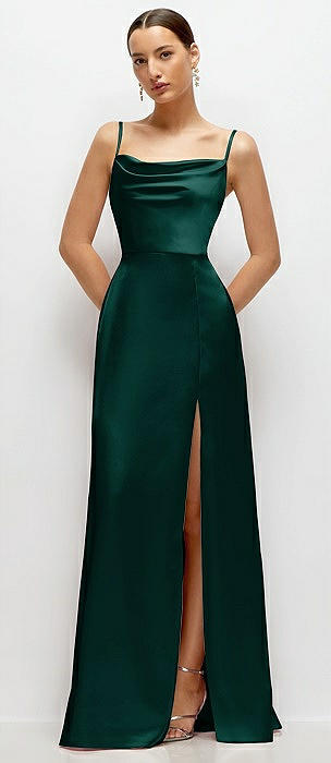 Cowl Neck Satin Maxi Dress with Adjustable Spaghetti Straps in evergreen