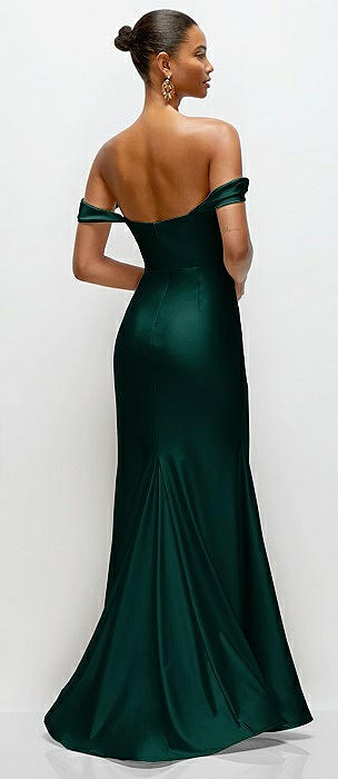 Basque-Neck A-Line Stretch Satin Maxi Dress with Off-the-Shoulder Drape in evergreen