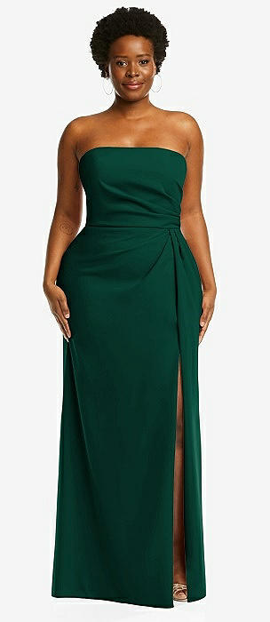 Strapless Pleated Faux Wrap Trumpet Gown with Front Slit in hunter green