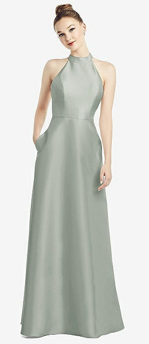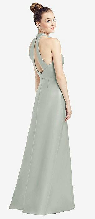 High-Neck Halter Open-Back Satin Trumpet Dress in willow green