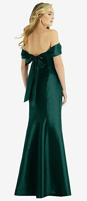 Off-the-Shoulder Bow-Back Satin Trumpet Gown in evergreen