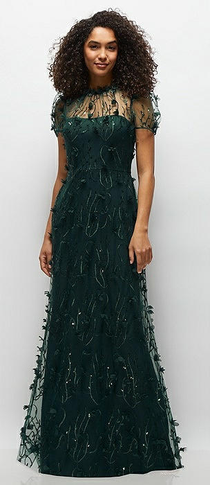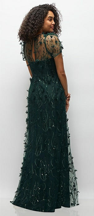 3D Floral Embroidered Puff Sleeve A-line Maxi Dress with Petal-Adorned Illusion Neckline in evergreen