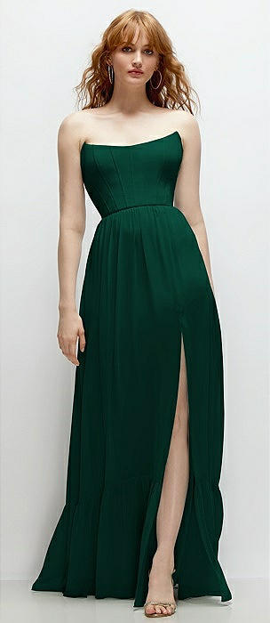 Strapless Cat-Eye Corset Maxi Dress with Ruffle Hem A-Line Skirt in hunter green