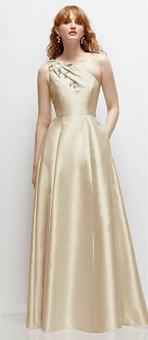 One-Shoulder Full A-Line Satin Gown with Handworked Floral Appliqué in champagne