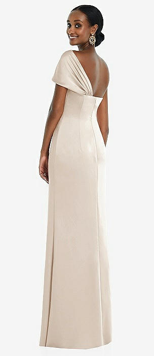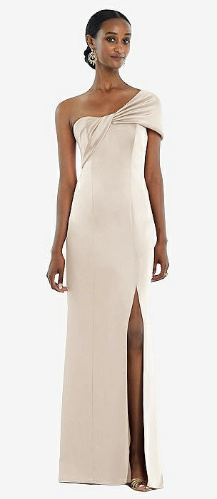 Draped One-Shoulder Satin Trumpet Gown with Front Slit in cameo