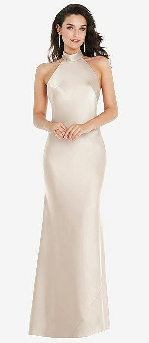 Draped Twist Halter Tie-Back Trumpet Gown in oat