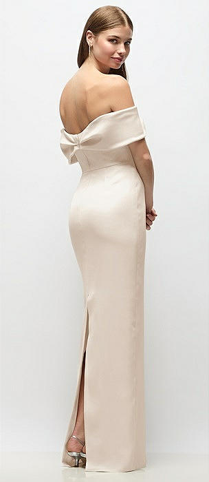 Basque-Neck Satin Column Maxi Dress with Off-the-Shoulder Bows in champagne