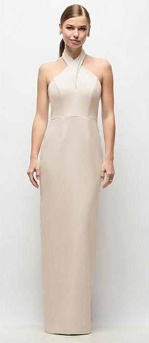 Criss-Cross Halter Open-Back Crepe Column Maxi Dress in oat