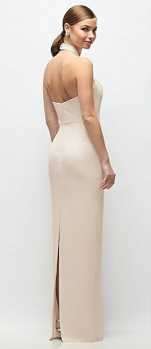 High-Neck Halter Stretch Satin Maxi Dress with Bias A-line Skirt in cashmere gray