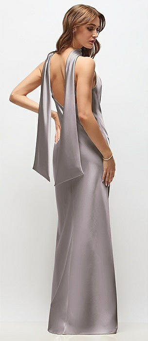Draped Scarf Halter Open-Back Stretch Satin Bias Maxi Dress with Adjustable Straps in cashmere gray