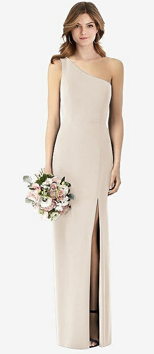 One-Shoulder Crepe Trumpet Gown with Front Slit in oat