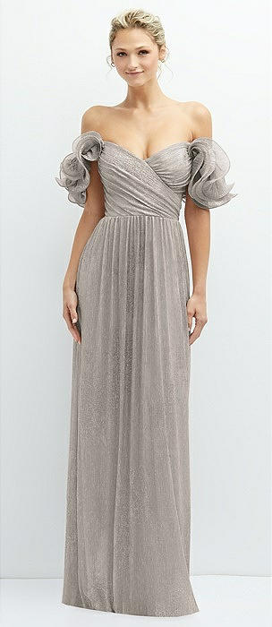 Dramatic Ruffle Edge Convertible Strap Metallic Pleated Maxi Dress in metallic taupe
