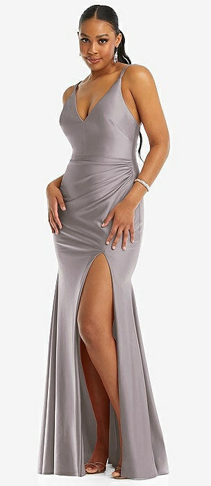 Deep V-Neck Stretch Satin Mermaid Dress with Slight Train in cashmere gray