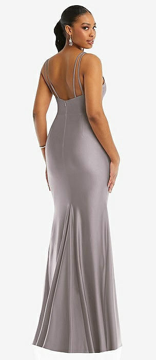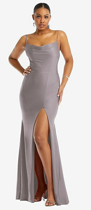 Cowl-Neck Open Tie-Back Stretch Satin Mermaid Dress with Slight Train in cashmere gray