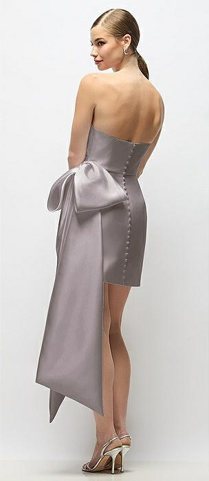 Strapless Pleated Draped Satin Mini Dress with Dramatic Long Tail Bow & Covered Buttons in cashmere gray