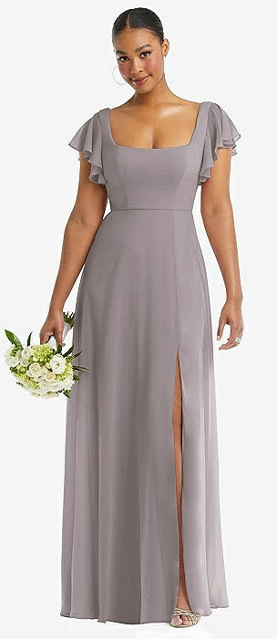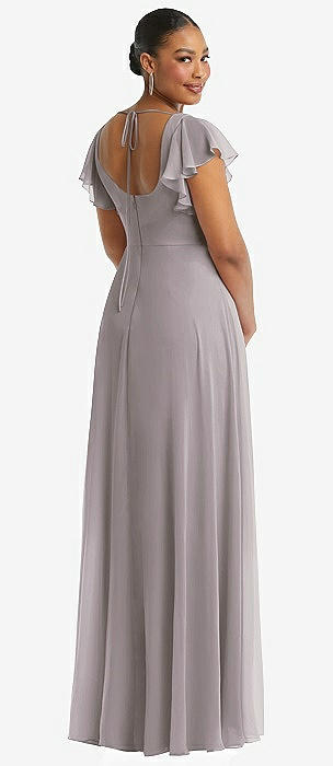 Flutter Sleeve Scoop Open-Back Chiffon Maxi Dress in cashmere gray