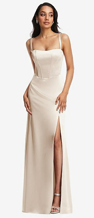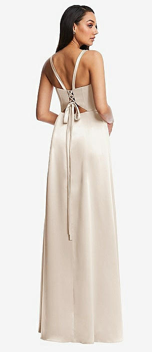 Lace Up Tie-Back Corset Maxi Dress with Front Slit in oat