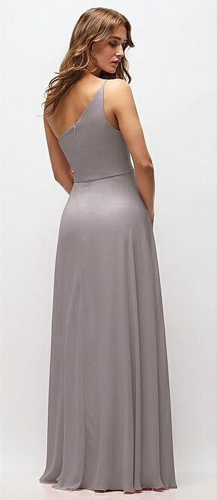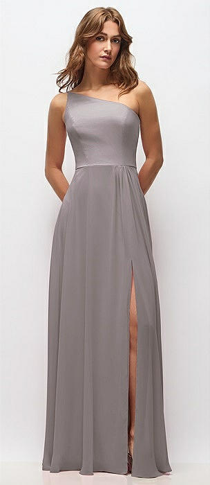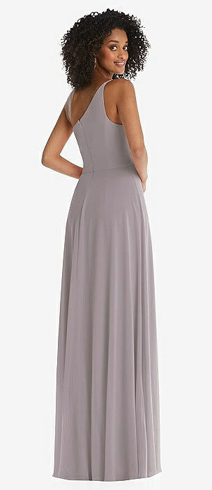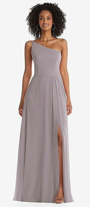 One-Shoulder Chiffon Maxi Dress with Shirred Front Slit in cashmere gray