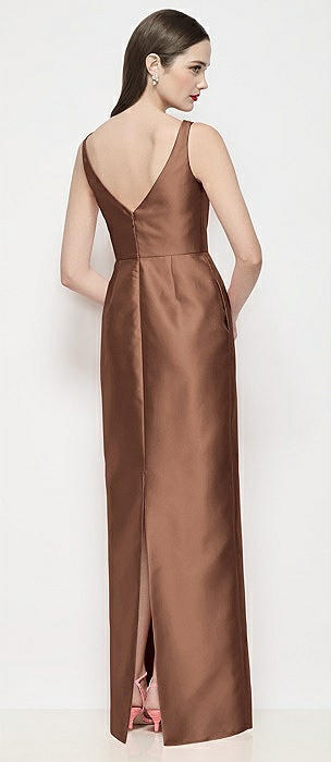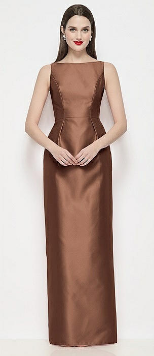 Bateau Neck Satin Maxi Dress with Pleated Column Skirt in cognac