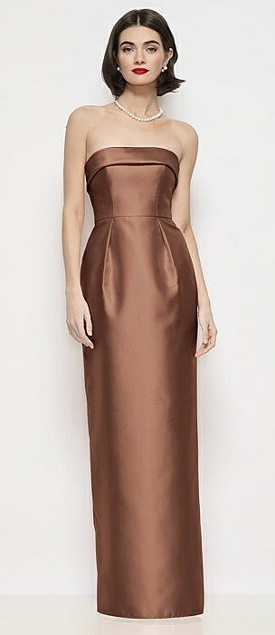 Strapless Pleated Empire Satin Column Maxi Dress in cognac