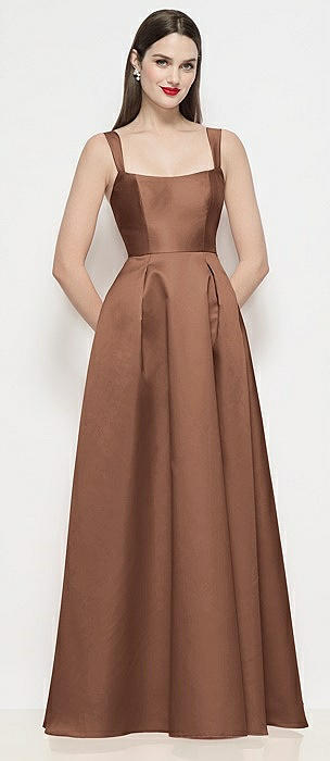 Shaped Strap Basque Neck Satin Maxi Dress with Pleated Skirt in cognac
