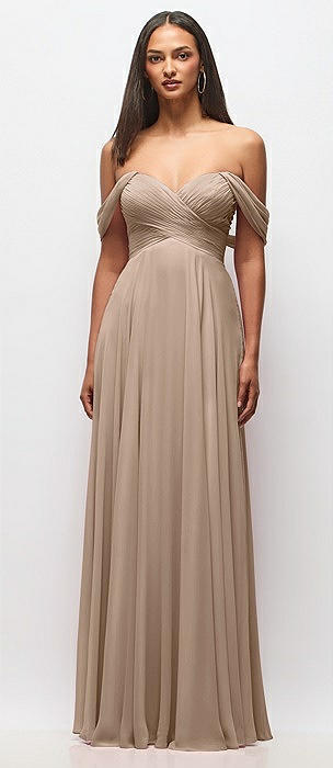 Off-the-Shoulder Pleated Cap Sleeve A-line Maxi Dress in cameo