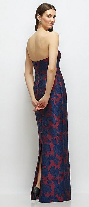 Strapless Heritage Floral Jacquard Column Dress with Back Slit in burgundy midnight floral