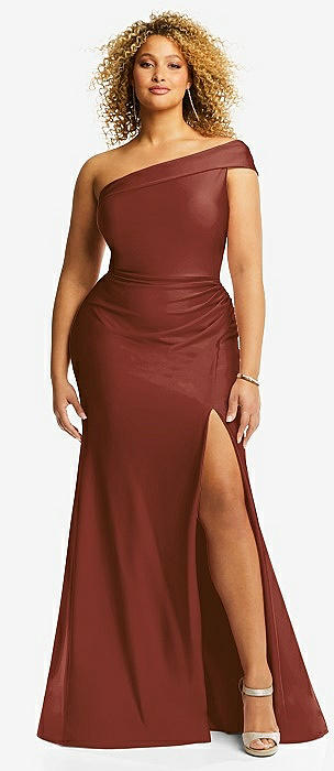 One-Shoulder Crepe Trumpet Gown with Front Slit in auburn moon